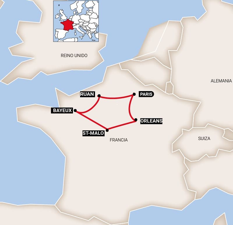 Desayuno y salida hacia el sur en dirección a Orléans, atravesando la hermosa región del Centro-Val de Loire. Esta ruta, que combina historia, arquitectura y paisajes tranquilos, nos lleva a través de una de las joyas del patrimonio francés: la ciudad de Chartres famosa por su imponente catedral gótica, considerada una de las más bellas y mejor conservadas de Europa. Tras explorar esta ciudad histórica, continuamos nuestro recorrido hacia Orléans, ciudad cargada de historia, especialmente ligada a la figura de Juana de Arco. Alojamiento.